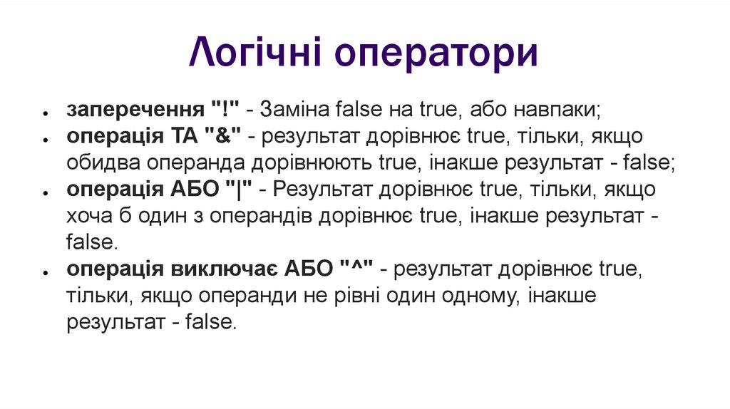 Логічні операторизаперечення "!" - Заміна false на true, або навпаки;