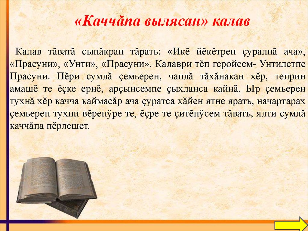 «Каччăпа вылясан» калавКалав тăватă сыпăкран тăрать: «Икĕ йĕкĕтрен çуралнă ача»,