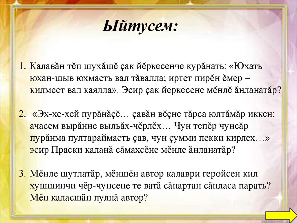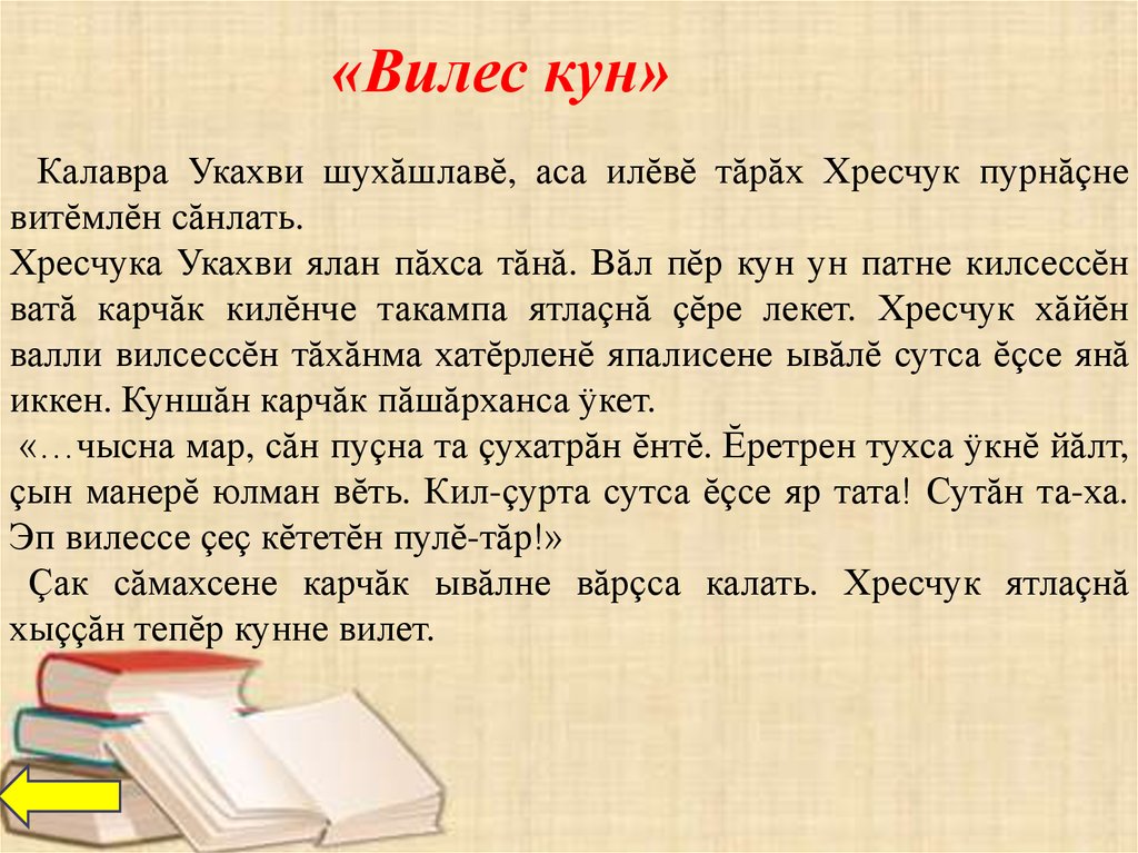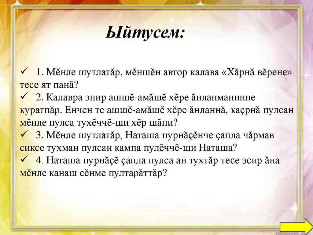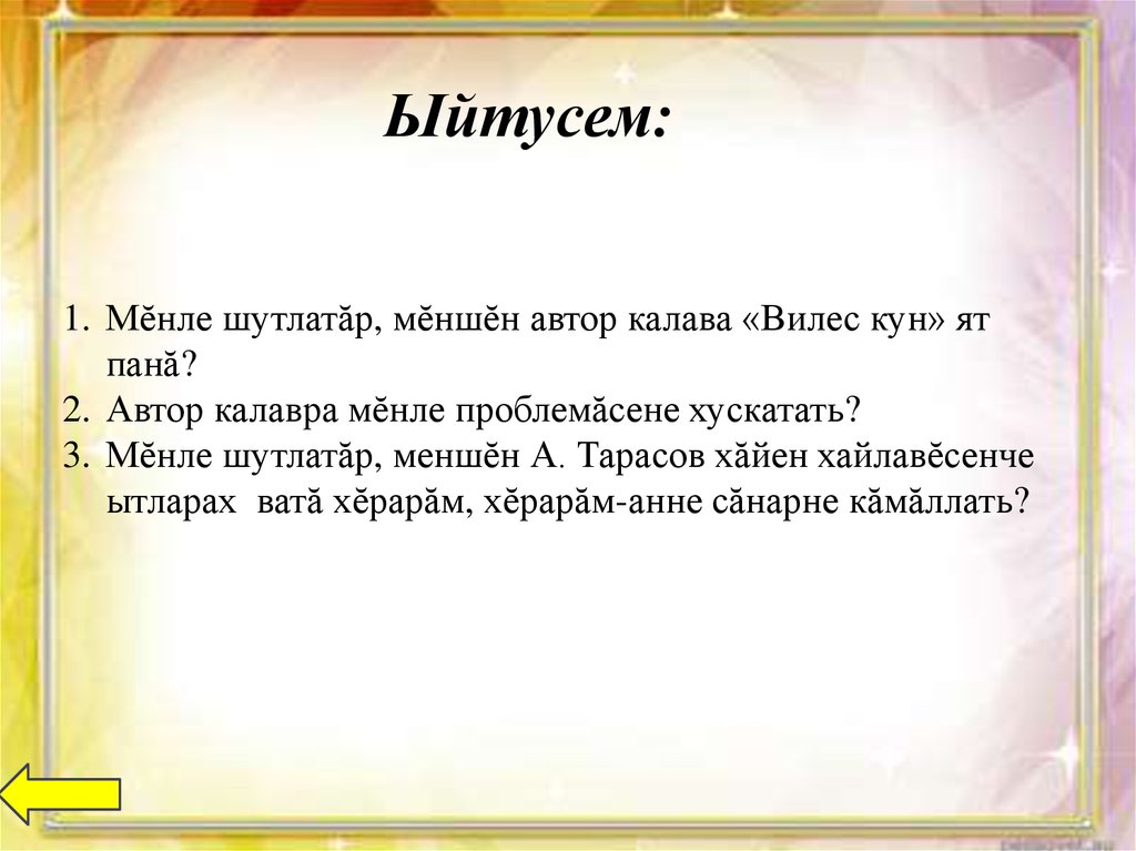 Ыйтусем:1. Мĕнле шутлатăр, мĕншĕн автор калава «Вилес кун» ят