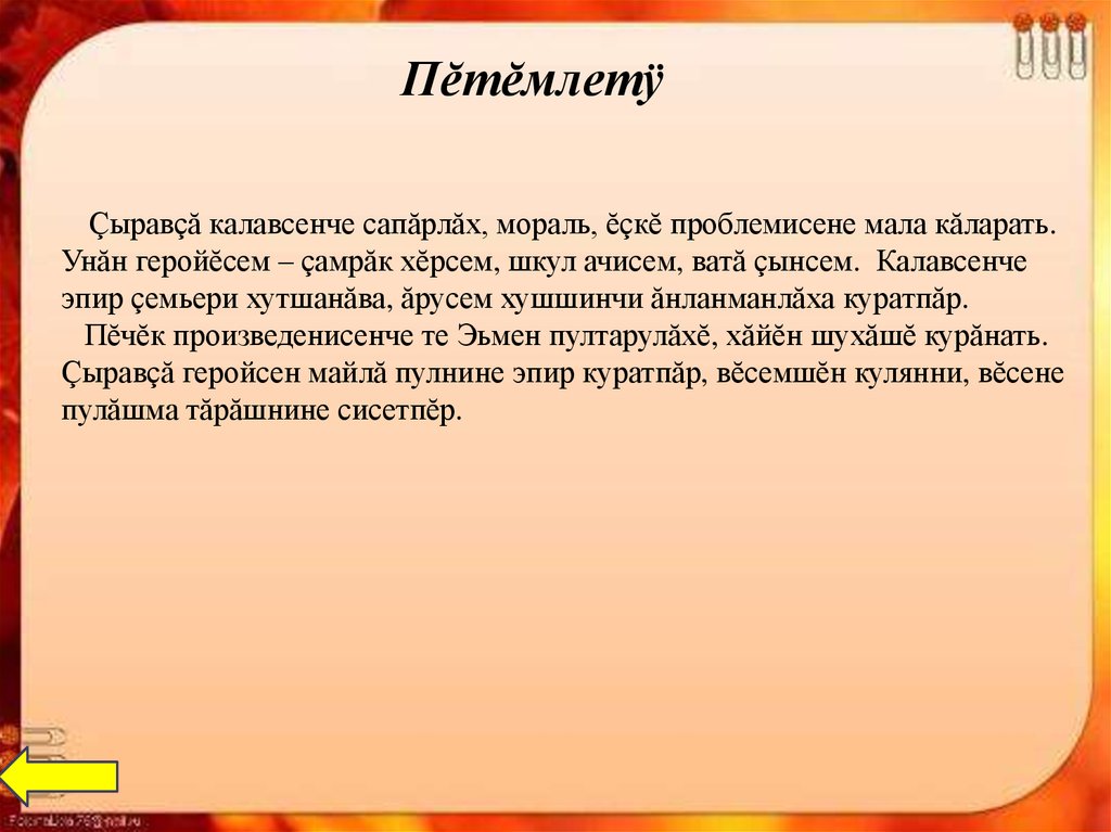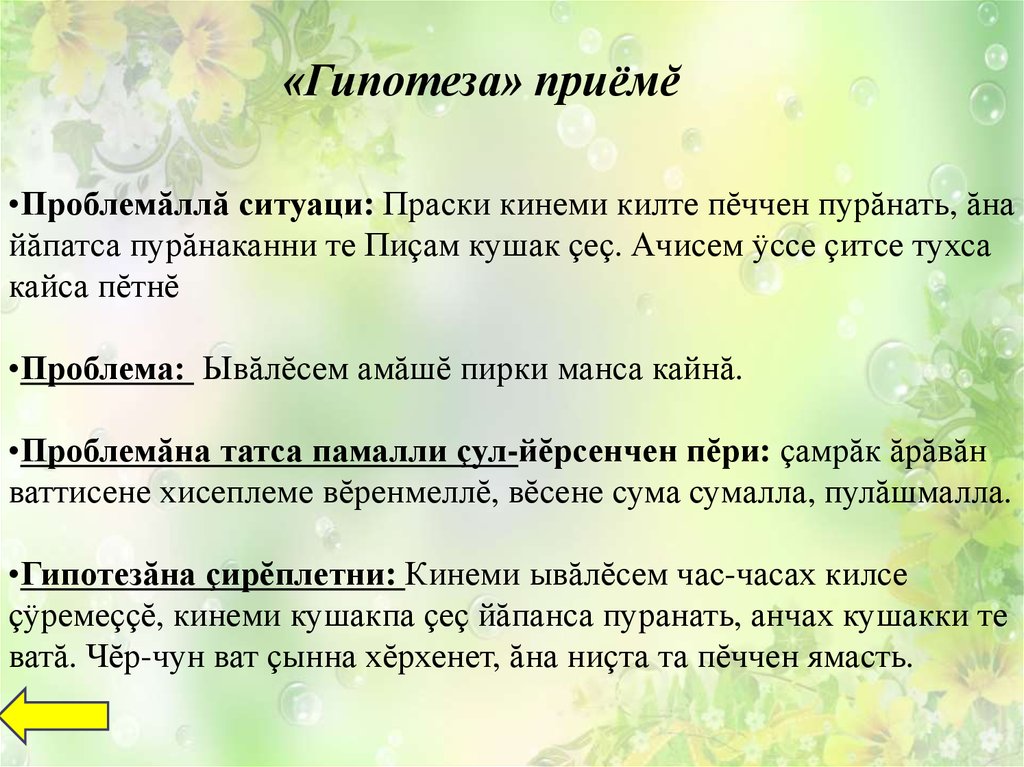 «Гипотеза» приёмĕ•Проблемăллă ситуаци: Праски кинеми килте пĕччен пурăнать, ăна