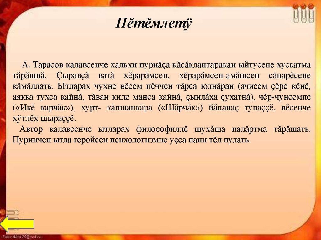 ПĕтĕмлетÿА. Тарасов калавсенче хальхи пурнăçа кăсăклантаракан ыйтусене хускатма