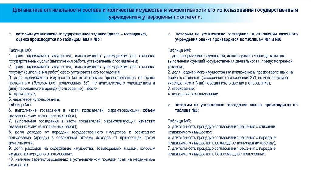 Для анализа оптимальности состава и количества имущества и эффективности его использования государственнымучреждением утверждены показатели: