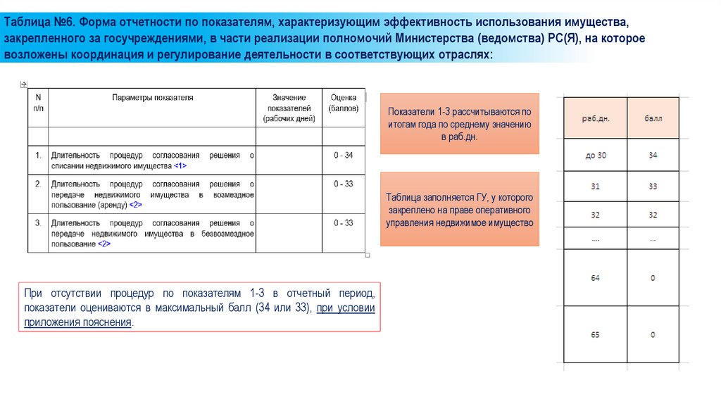 Таблица №6. Форма отчетности по показателям, характеризующим эффективность использования имущества,закрепленного за госучреждениями, в части реализации полномочий Министерства (ведомства) РС(Я), на которое