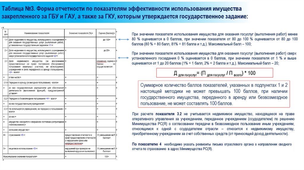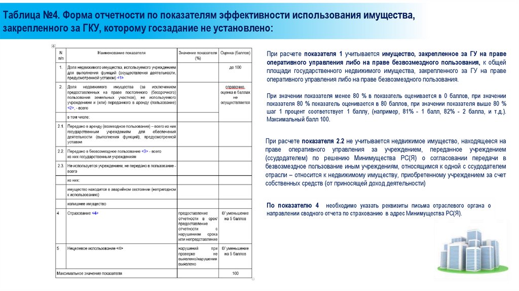 Таблица №4. Форма отчетности по показателям эффективности использования имущества,закрепленного за ГКУ, которому госзадание не установлено: