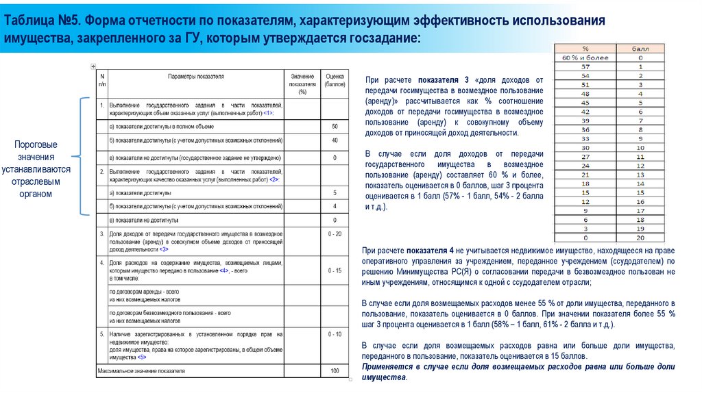 Таблица №5. Форма отчетности по показателям, характеризующим эффективность использованияимущества, закрепленного за ГУ, которым утверждается госзадание: