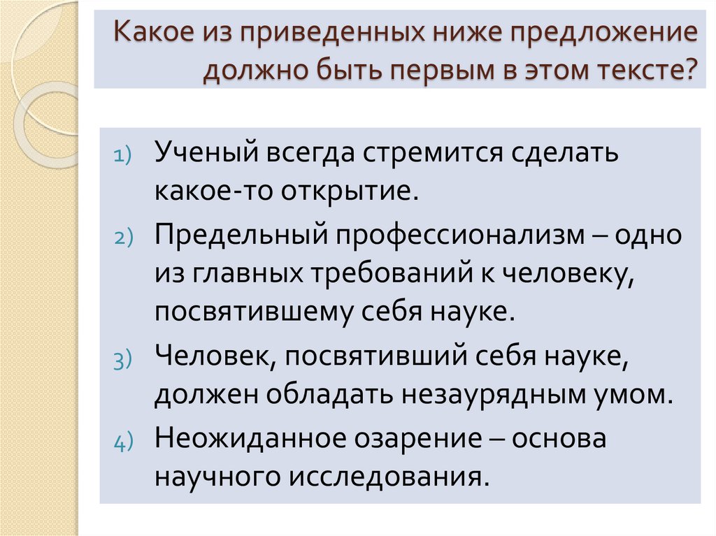 Какое из приведенных ниже предложениедолжно быть первым в этом тексте?