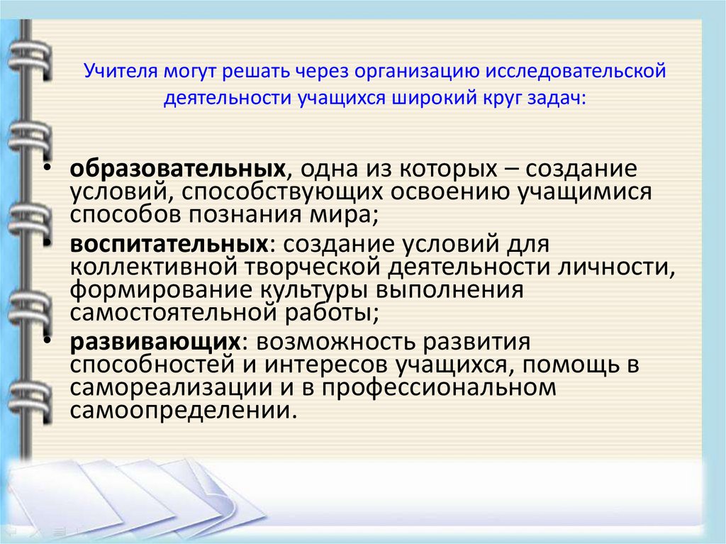 Учителя могут решать через организацию исследовательскойдеятельности учащихся широкий круг задач: