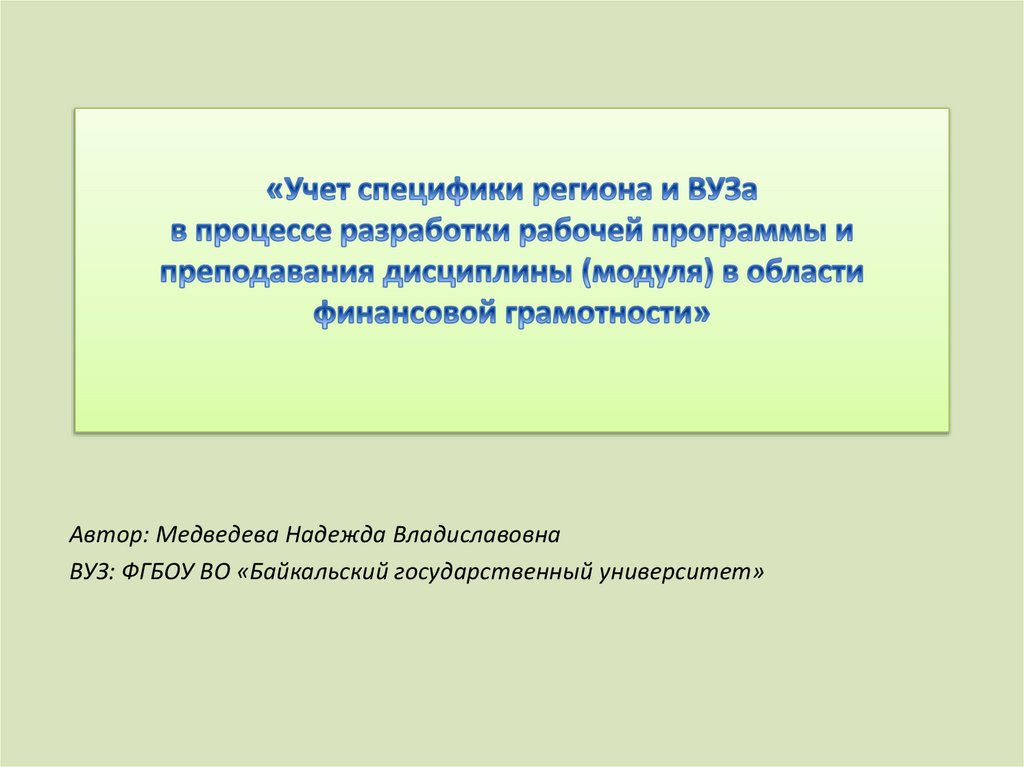Учет специфики региона и ВУЗа в процессе разработки рабочей программы и преподавания дисциплины в области финансовой грамотности