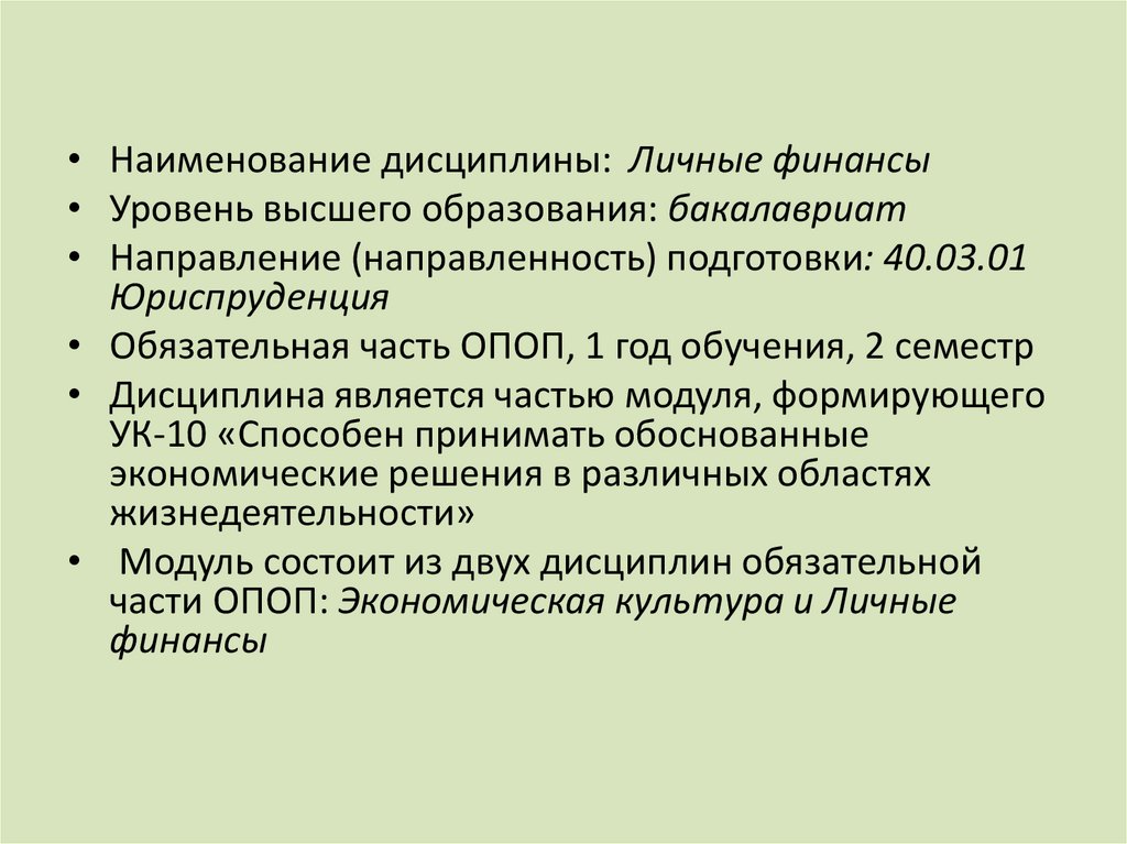 • Наименование дисциплины: Личные финансы• Уровень высшего образования: бакалавриат