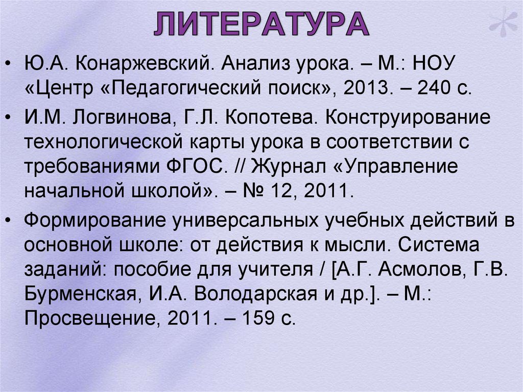 • Ю.А. Конаржевский. Анализ урока. – М.: НОУ«Центр «Педагогический поиск», 2013. – 240 с.