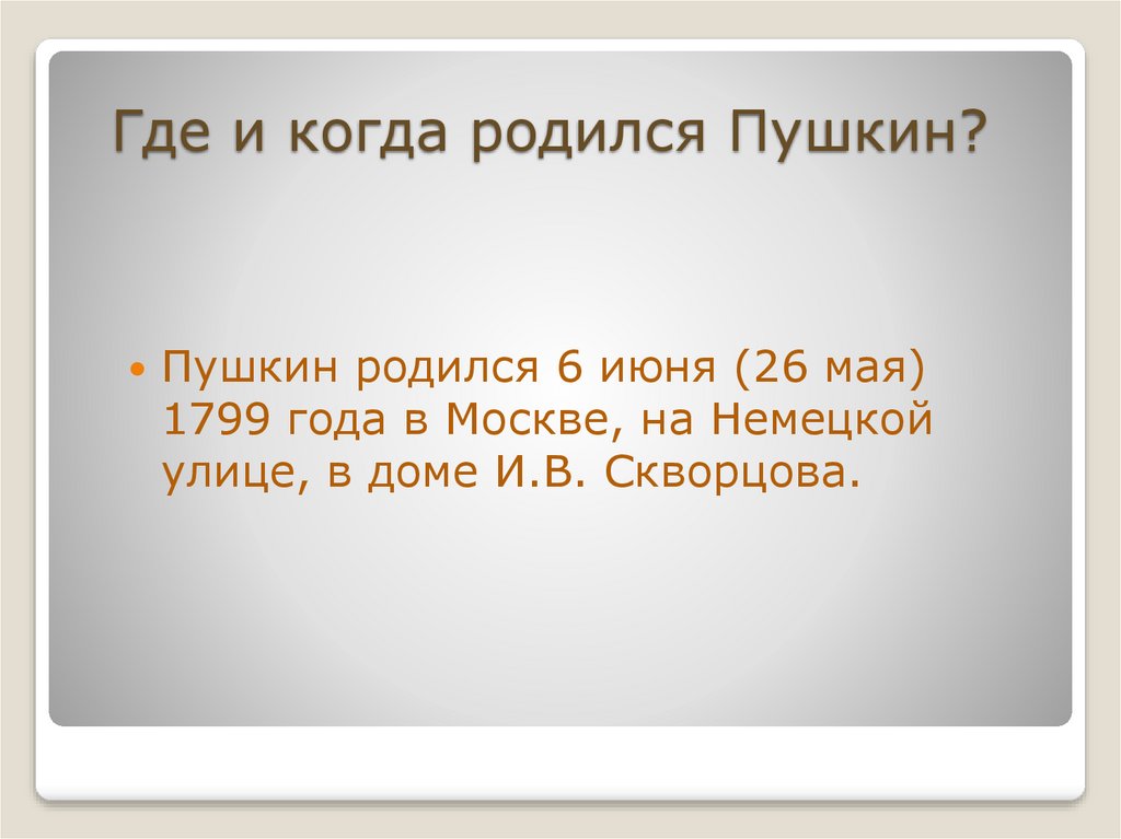 Где и когда родился Пушкин?Пушкин родился 6 июня (26 мая)