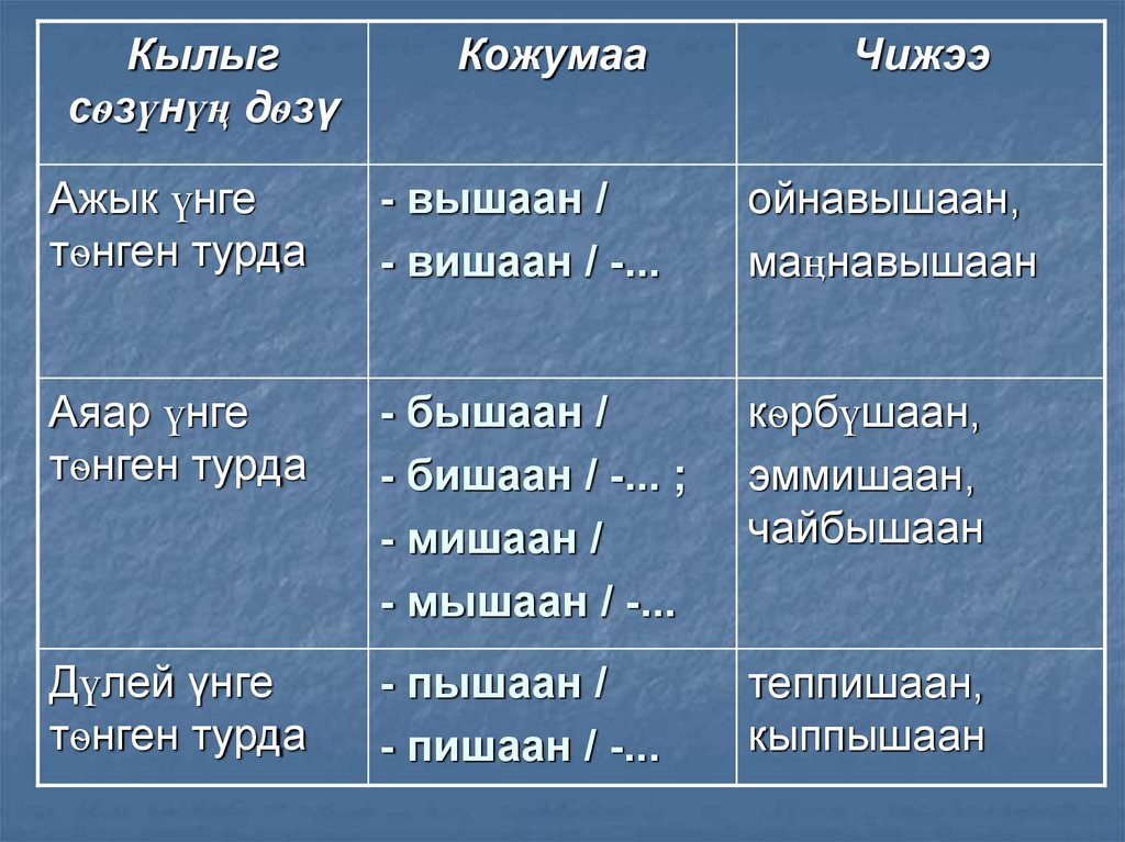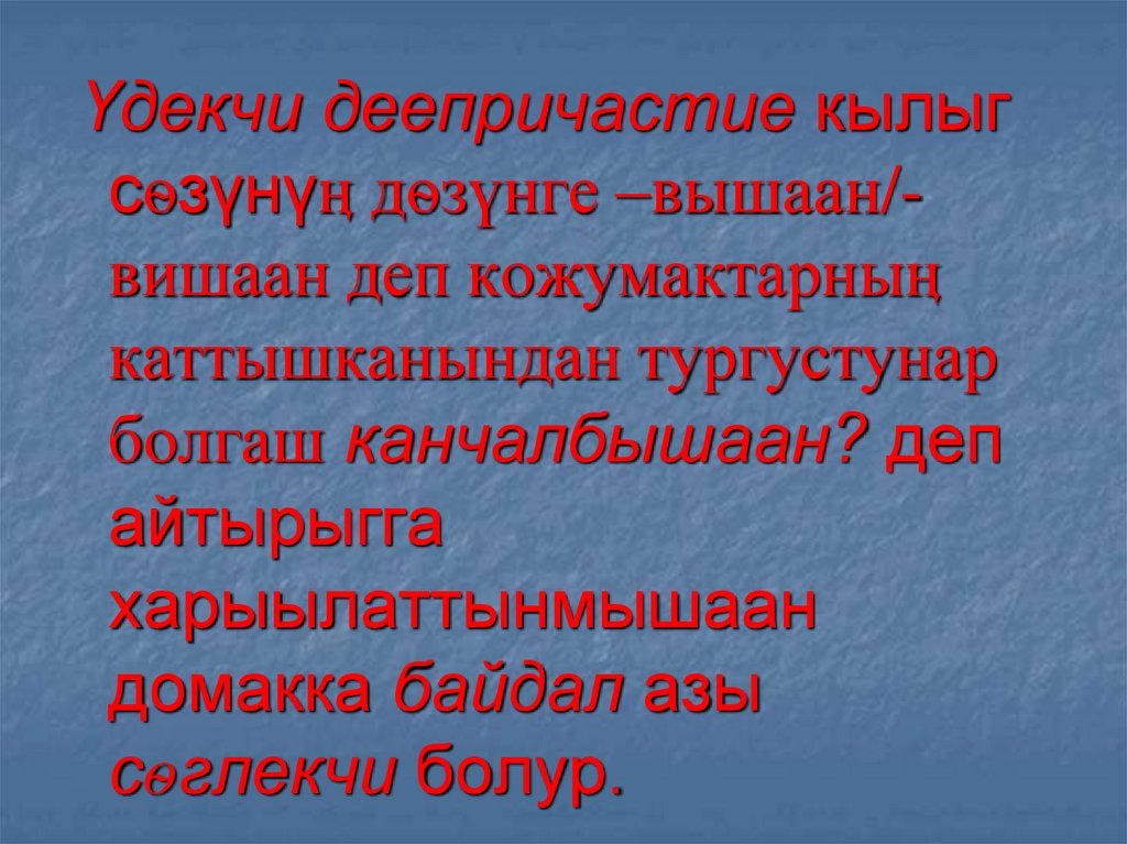 Үдекчи деепричастие кылыгсѳзүнүӊ дѳзүнге –вышаан/вишаан деп кожумактарныӊ