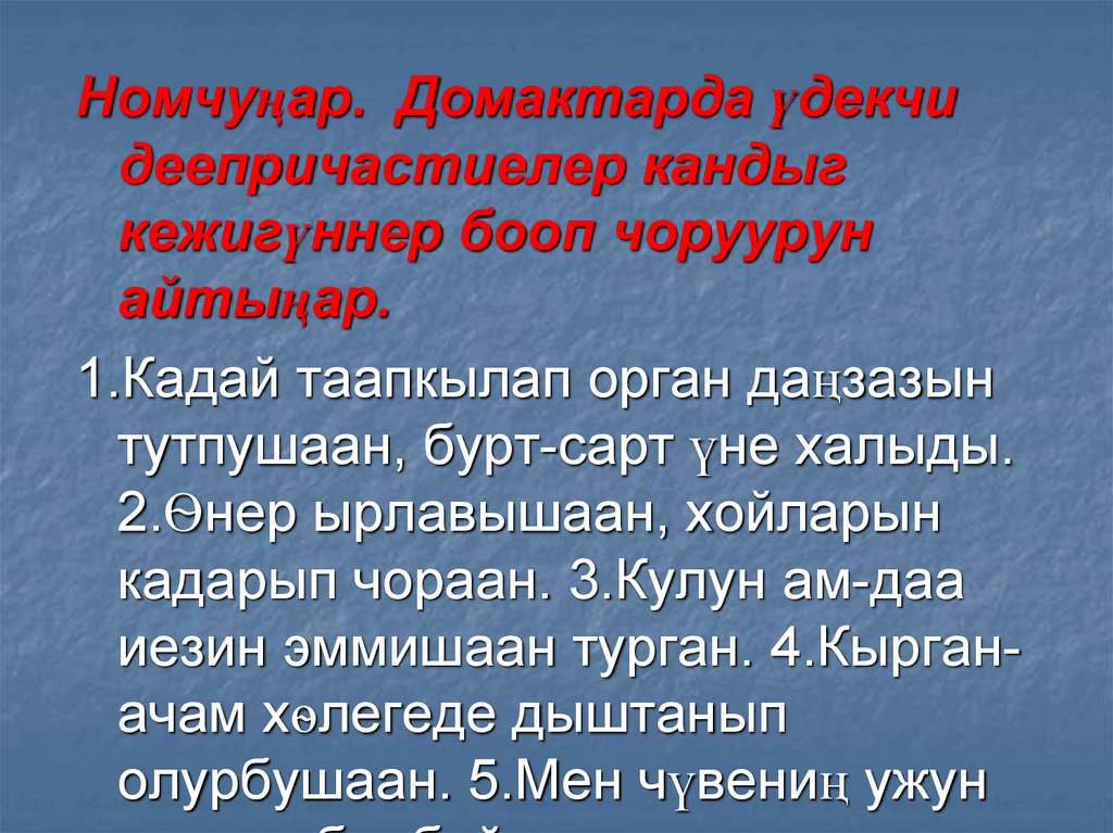 Номчуңар. Домактарда үдекчидеепричастиелер кандыг