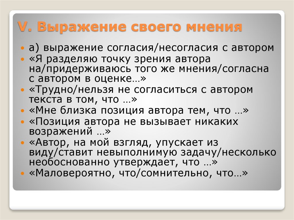 V. Выражение своего мненияа) выражение согласия/несогласия с автором