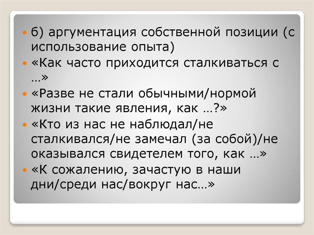б) аргументация собственной позиции (сиспользование опыта)