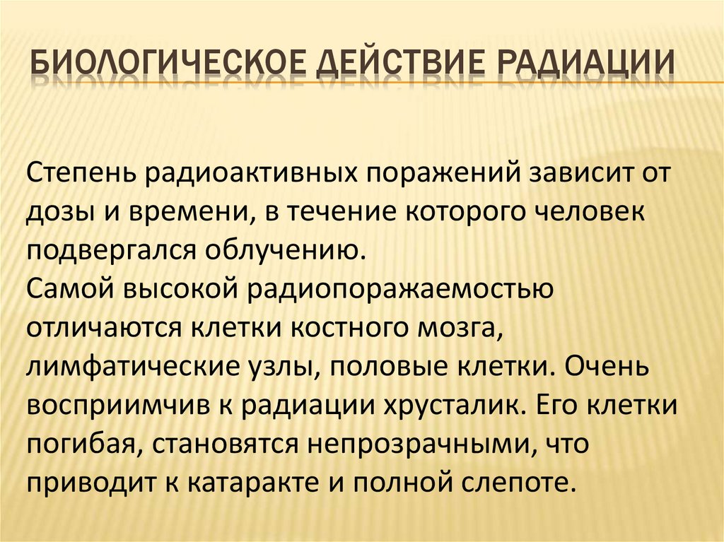 БИОЛОГИЧЕСКОЕ ДЕЙСТВИЕ РАДИАЦИИСтепень радиоактивных поражений зависит от