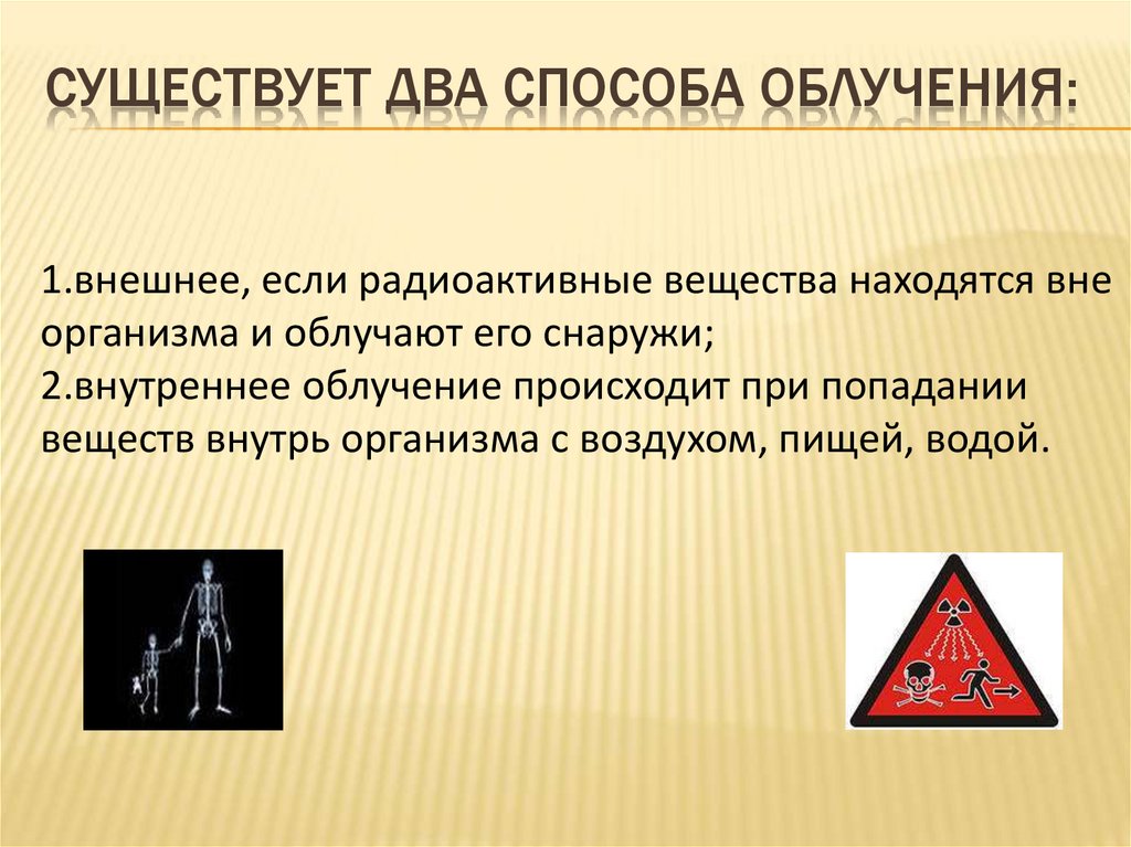СУЩЕСТВУЕТ ДВА СПОСОБА ОБЛУЧЕНИЯ:1.внешнее, если радиоактивные вещества находятся вне