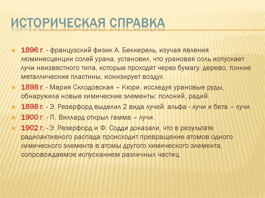 ИСТОРИЧЕСКАЯ СПРАВКА1896 г. - французский физик А. Беккерель, изучая явления