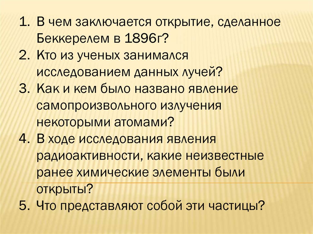 1. В чем заключается открытие, сделанноеБеккерелем в 1896г?