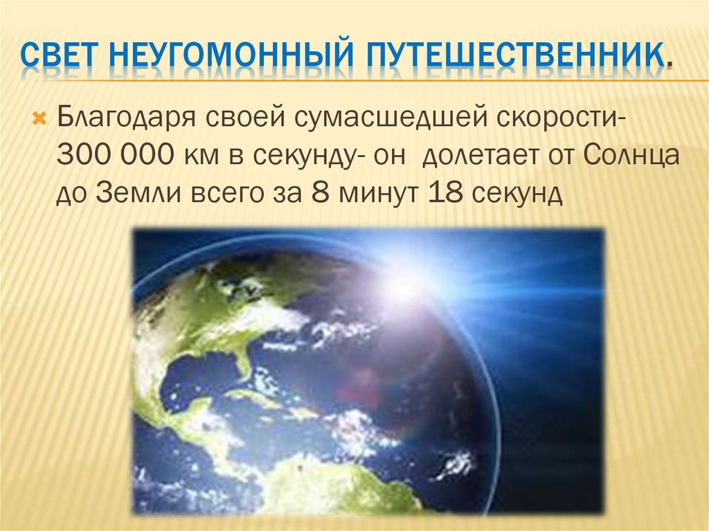 СВЕТ НЕУГОМОННЫЙ ПУТЕШЕСТВЕННИК.Благодаря своей сумасшедшей скорости300 000 км в секунду- он долетает от Солнца