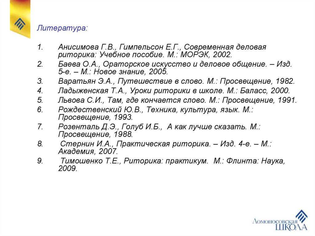 Ладыженская Т.А., Уроки риторики в школе. М.: Баласс, 2000.