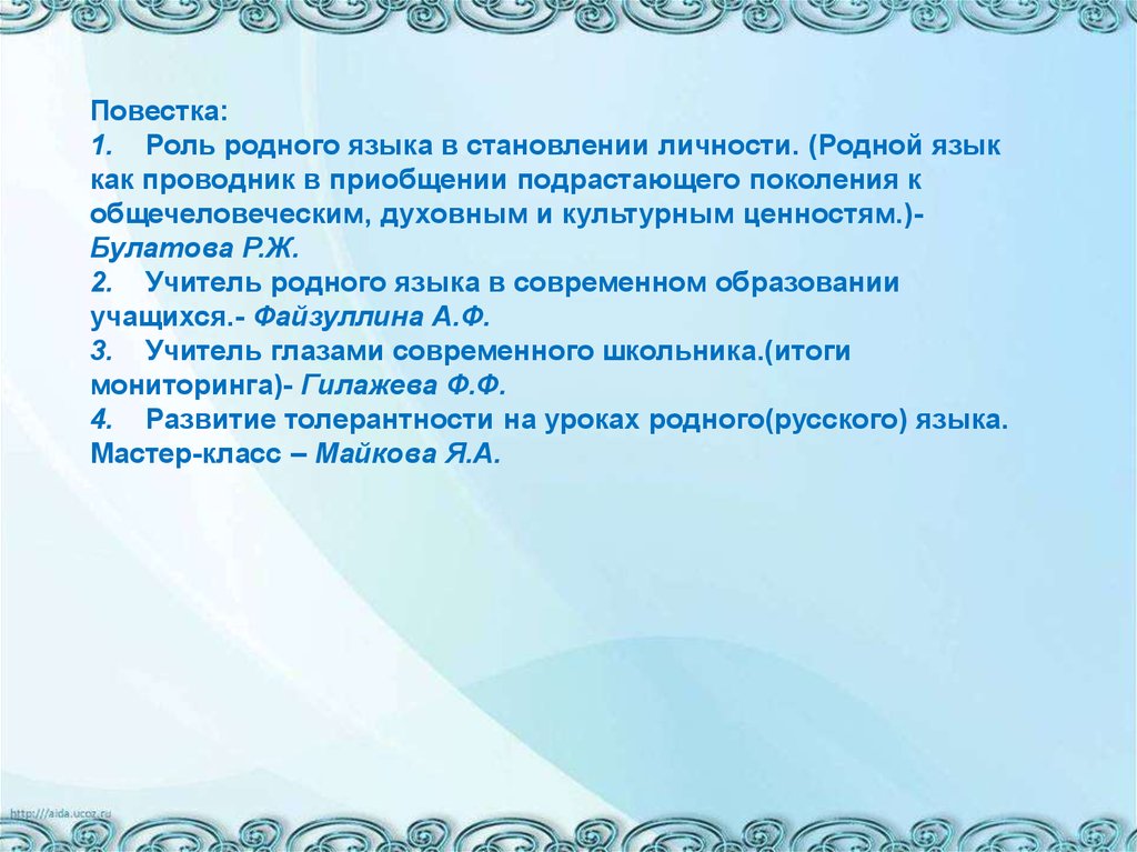 Повестка:1. Роль родного языка в становлении личности. (Родной язык