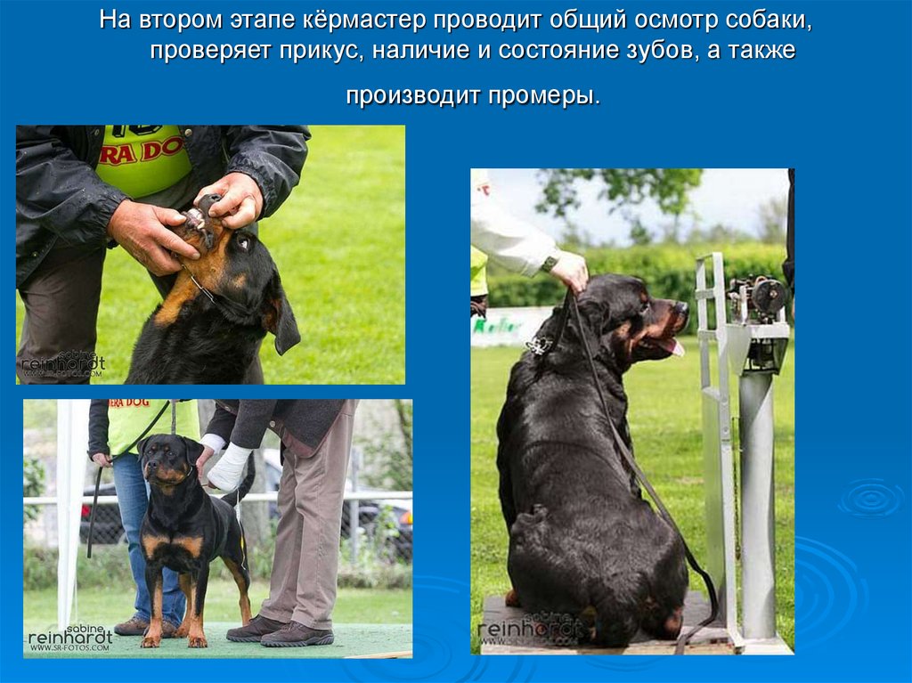 На втором этапе кёрмастер проводит общий осмотр собаки,проверяет прикус, наличие и состояние зубов, а также