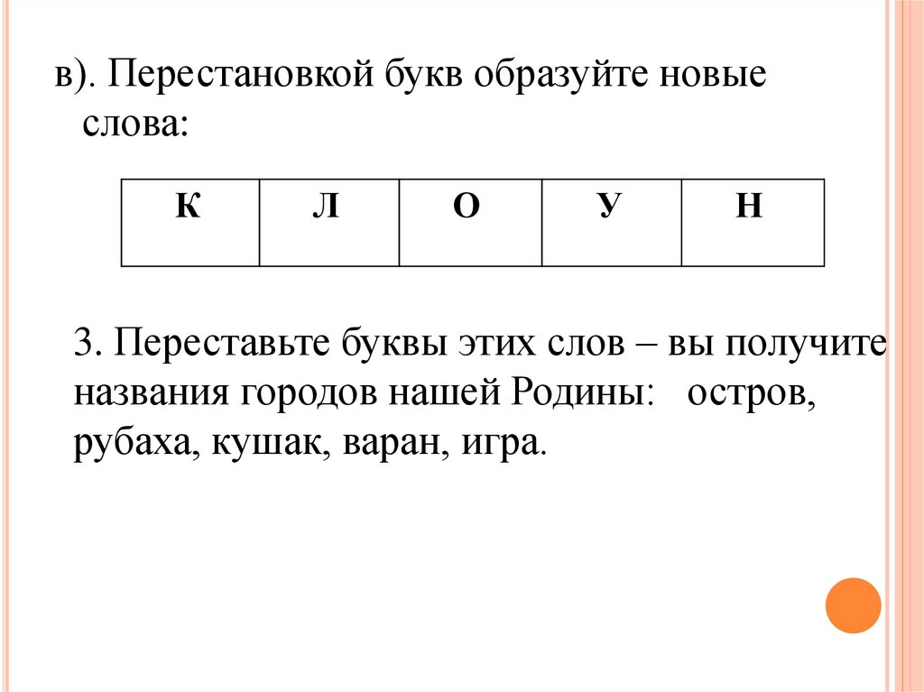 в). Перестановкой букв образуйте новыеслова: