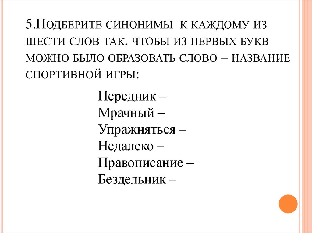 5.ПОДБЕРИТЕ СИНОНИМЫ К КАЖДОМУ ИЗШЕСТИ СЛОВ ТАК, ЧТОБЫ ИЗ ПЕРВЫХ БУКВ