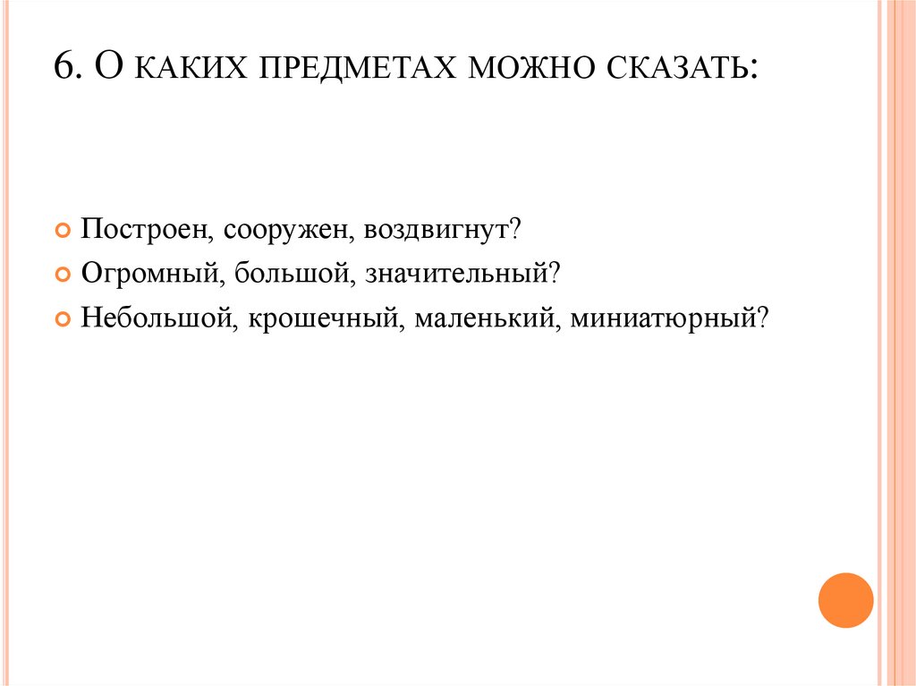 6. О КАКИХ ПРЕДМЕТАХ МОЖНО СКАЗАТЬ:Построен, сооружен, воздвигнут?