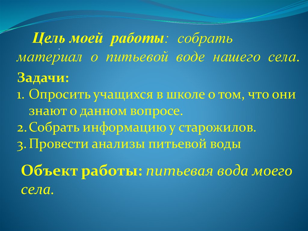 Цель. моей работы: собратьматериал о питьевой воде нашего села.