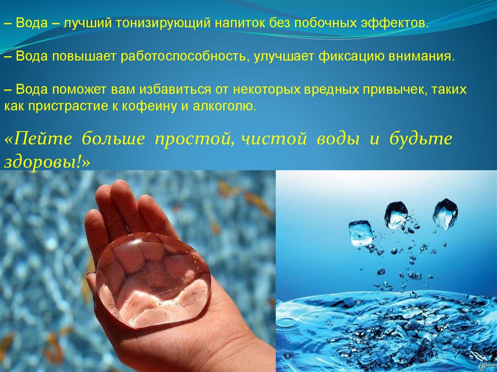 – Вода – лучший тонизирующий напиток без побочных эффектов.– Вода повышает работоспособность, улучшает фиксацию внимания.