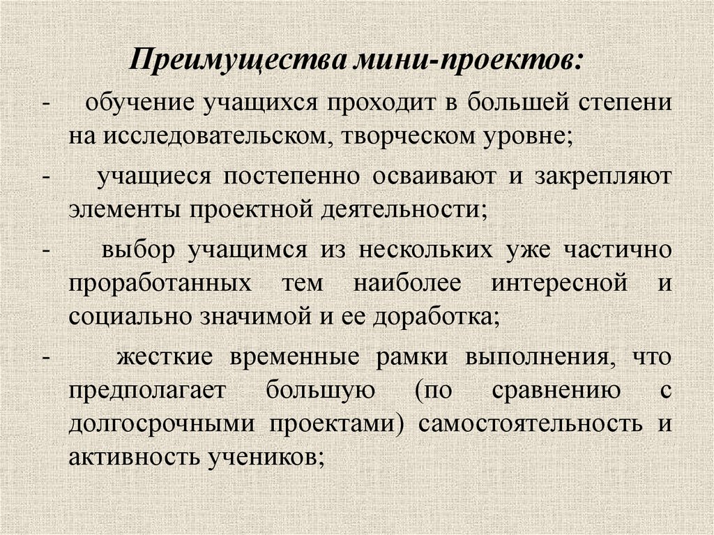 Преимущества мини-проектов:обучение учащихся проходит в большей степени