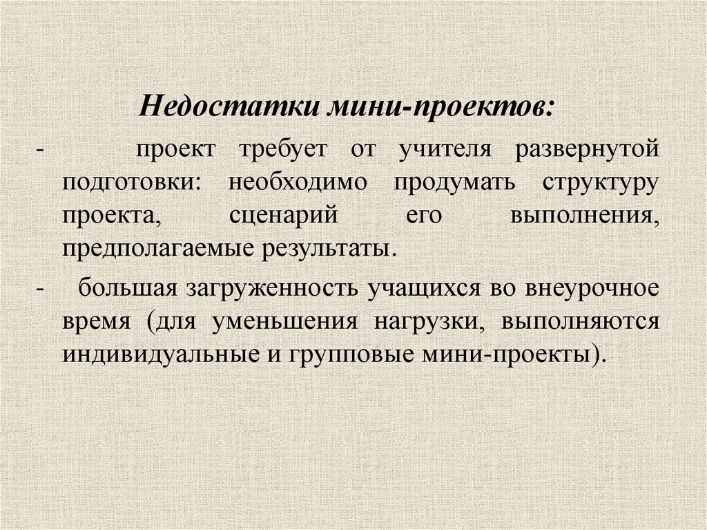 Недостатки мини-проектов:проект требует от учителя развернутой