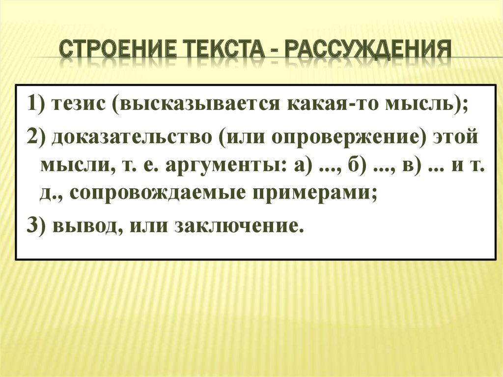 СТРОЕНИЕ ТЕКСТА - РАССУЖДЕНИЯ1) тезис (высказывается какая-то мысль);
