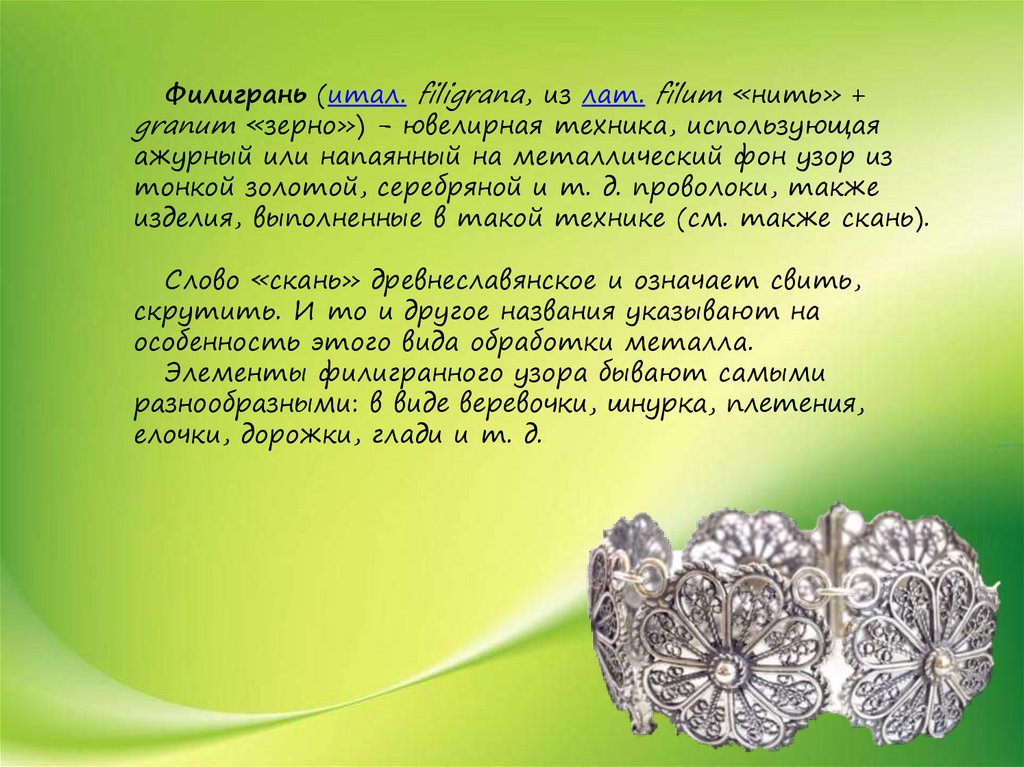 Филигрань (итал. filigrana, из лат. filum «нить» +granum «зерно») - ювелирная техника, использующая