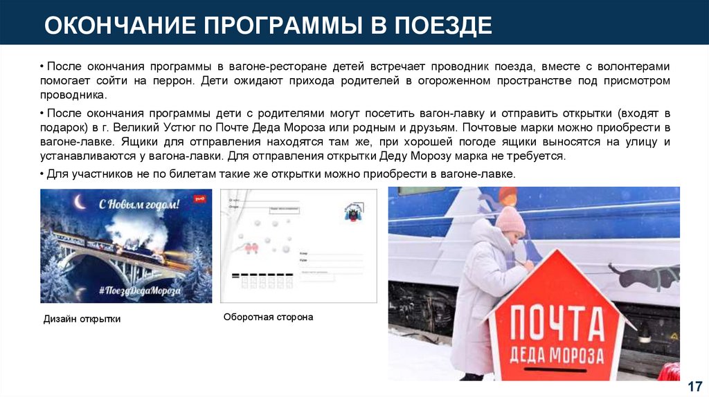 • После окончания программы дети с родителями могут посетить вагон-лавку и отправить открытки (входят в