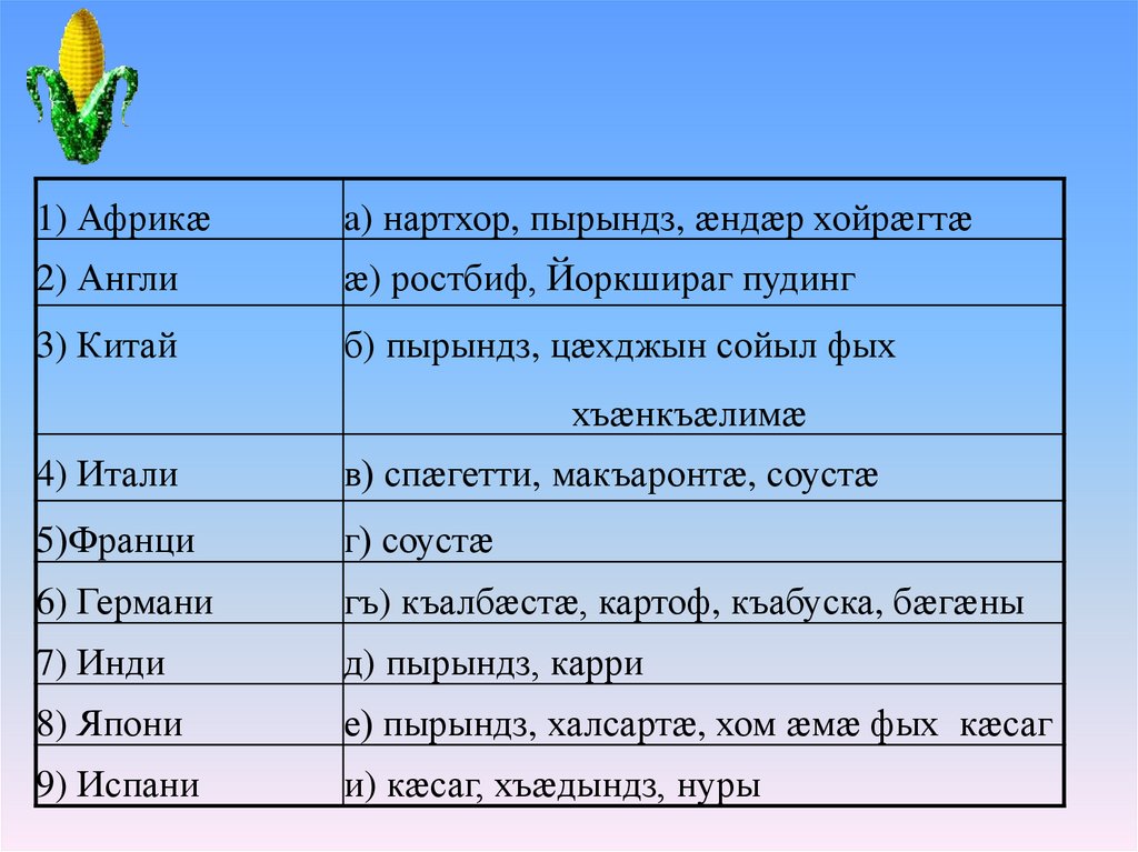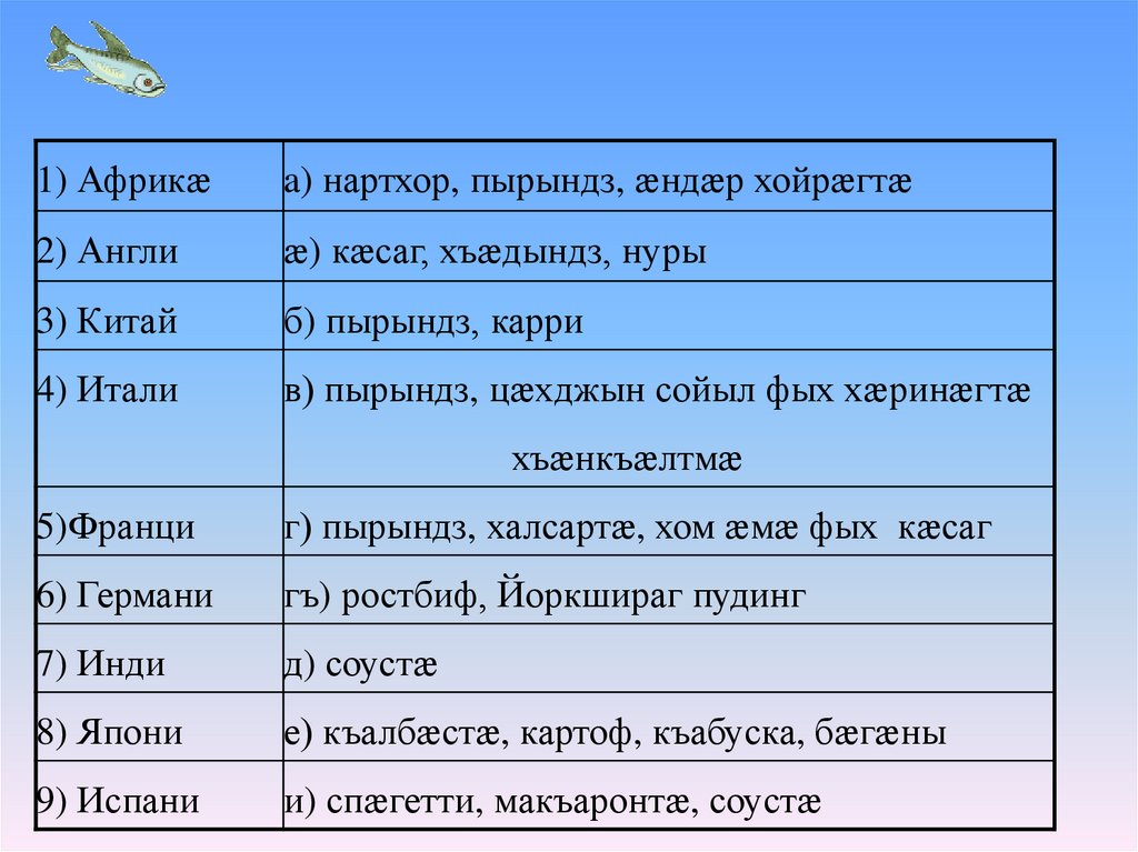 1. Темæ: Дунейы адæмты хæринæгтæ Кухня народов мира