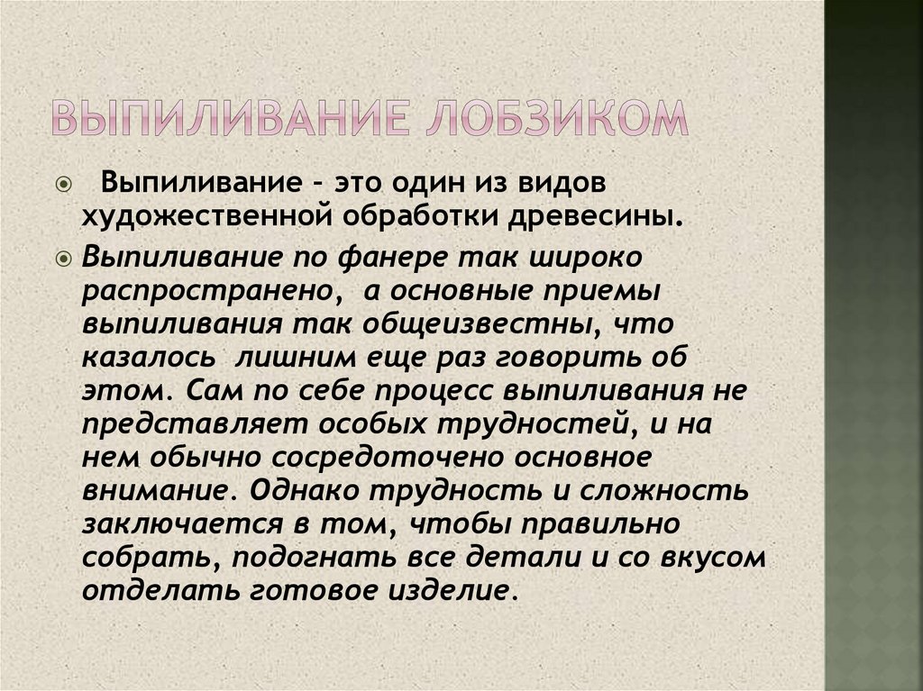 Выпиливание – это один из видовхудожественной обработки древесины.