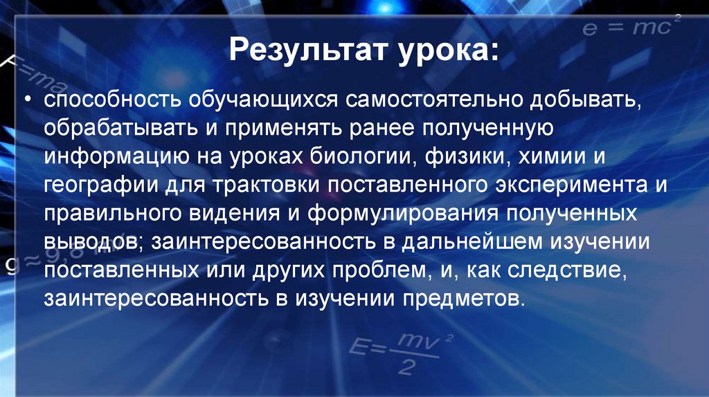 Результат урока:• способность обучающихся самостоятельно добывать,