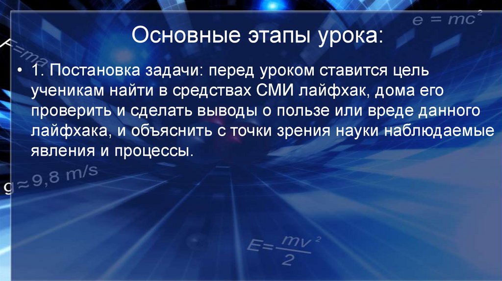 Основные этапы урока:• 1. Постановка задачи: перед уроком ставится цель