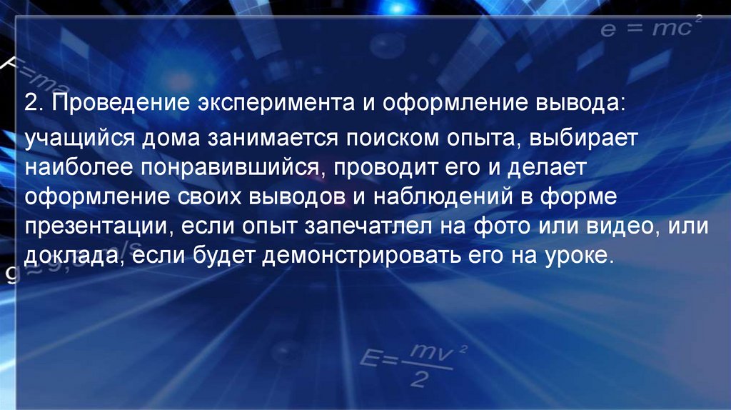 2. Проведение эксперимента и оформление вывода:учащийся дома занимается поиском опыта, выбирает