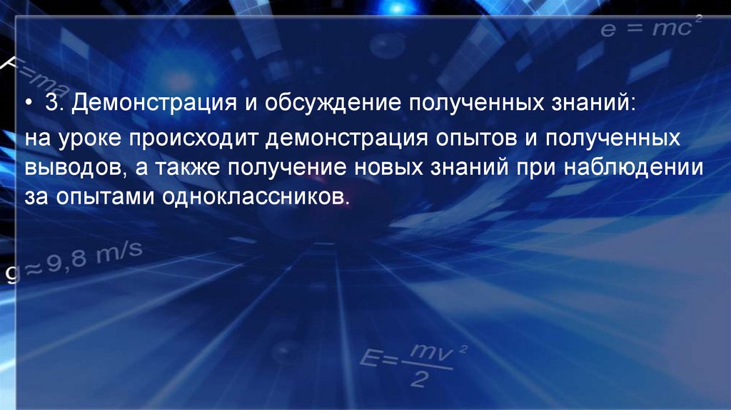 • 3. Демонстрация и обсуждение полученных знаний:на уроке происходит демонстрация опытов и полученных