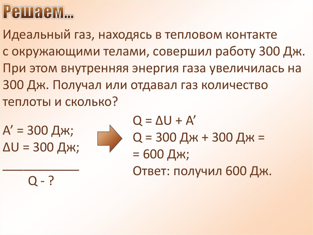 Идеальный газ, находясь в тепловом контактес окружающими телами, совершил работу 300 Дж.