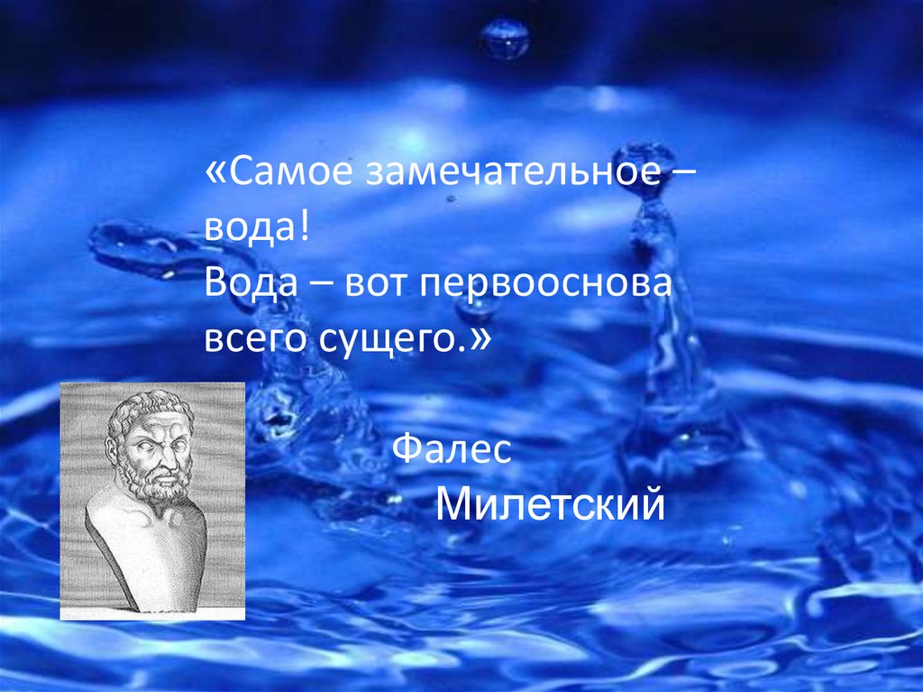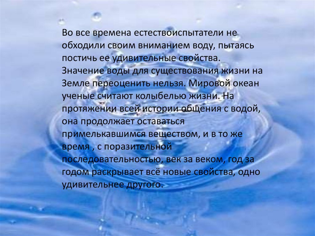 Во все времена естествоиспытатели необходили своим вниманием воду, пытаясь