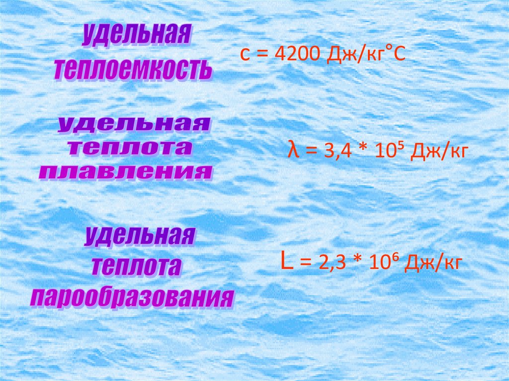 с = 4200 Дж/кг°Сλ = 3,4 * 10⁵ Дж/кг