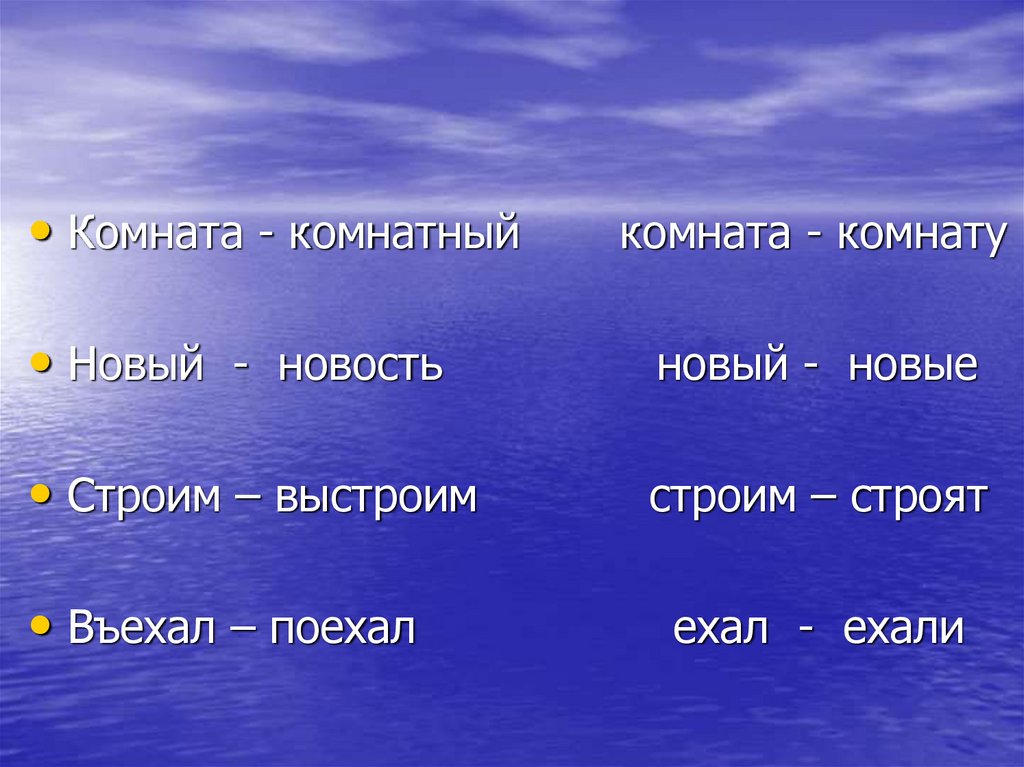 13. КОМНАТА-КОМНАТНЫЙ КОМНАТА-КОМНАТУ НОВЫЙ-НОВОСТЬ НОВЫЙ-НОВЫЕ СТРОИМ-ВЫСТРОИМ СТРОИМ-СТРОЯТ ВЪЕХАЛ-ПОЕХАЛ ЕХАЛ-ЕХАЛИ