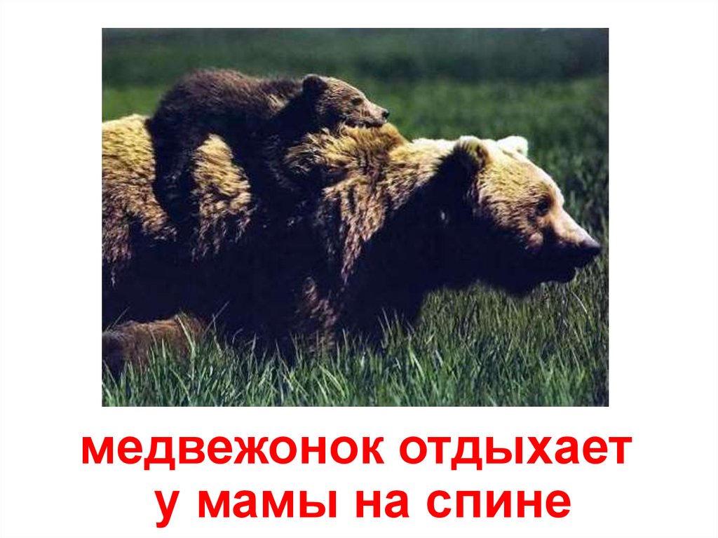медвежонок отдыхаету мамы на спине