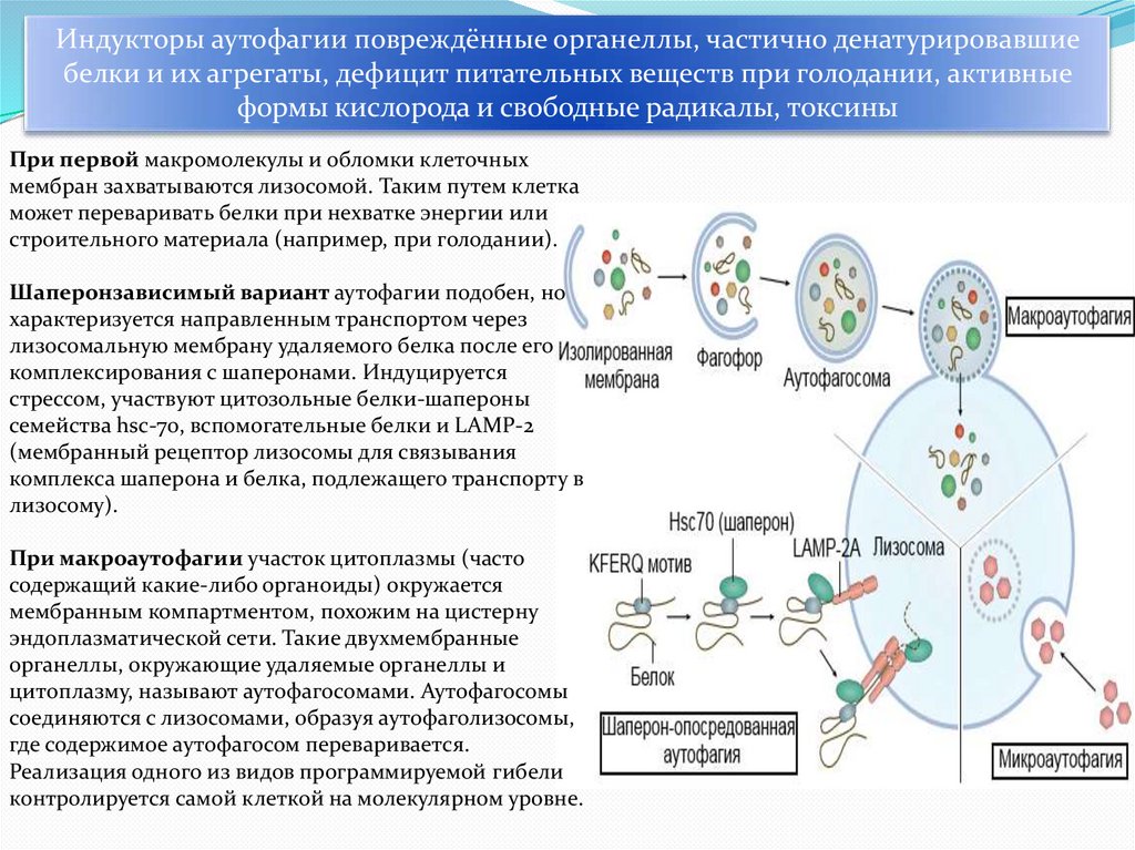 Индукторы аутофагии повреждённые органеллы, частично денатурировавшиебелки и их агрегаты, дефицит питательных веществ при голодании, активные