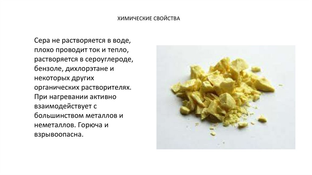 ХИМИЧЕСКИЕ СВОЙСТВАСера не растворяется в воде,